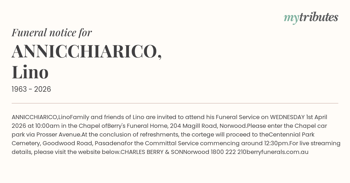 Family and friends of Lino are invited to attend his Funeral Service on WEDNESDAY 1st April 2026 at 10:00am in the Chapel of