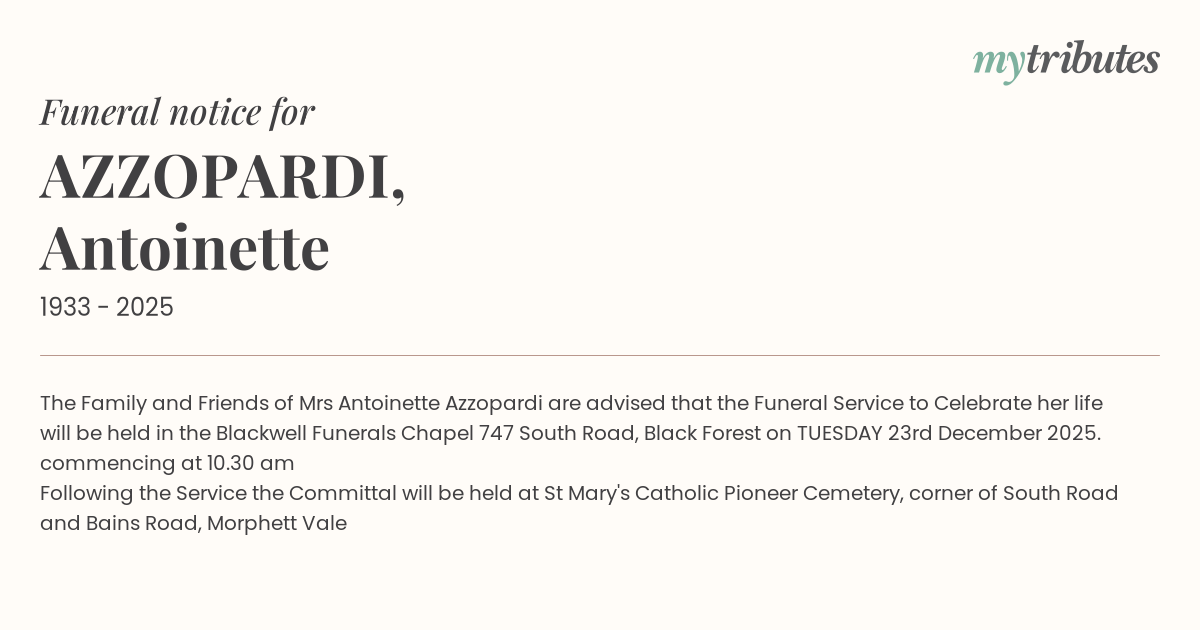 16°CThe Family and Friends of Mrs Antoinette Azzopardi are advised that the Funeral Service to Celebrate her life will be held in the Blackwell Funerals Chapel 747 South Road, Black Forest on TUESDAY 23rd December 2025. commencing at 10.30 am