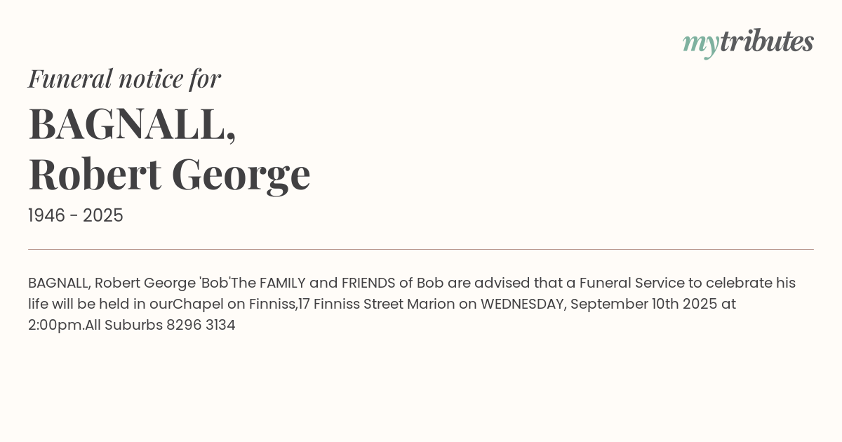 The FAMILY and FRIENDS of Bob are advised that a Funeral Service to celebrate his life will be held in our