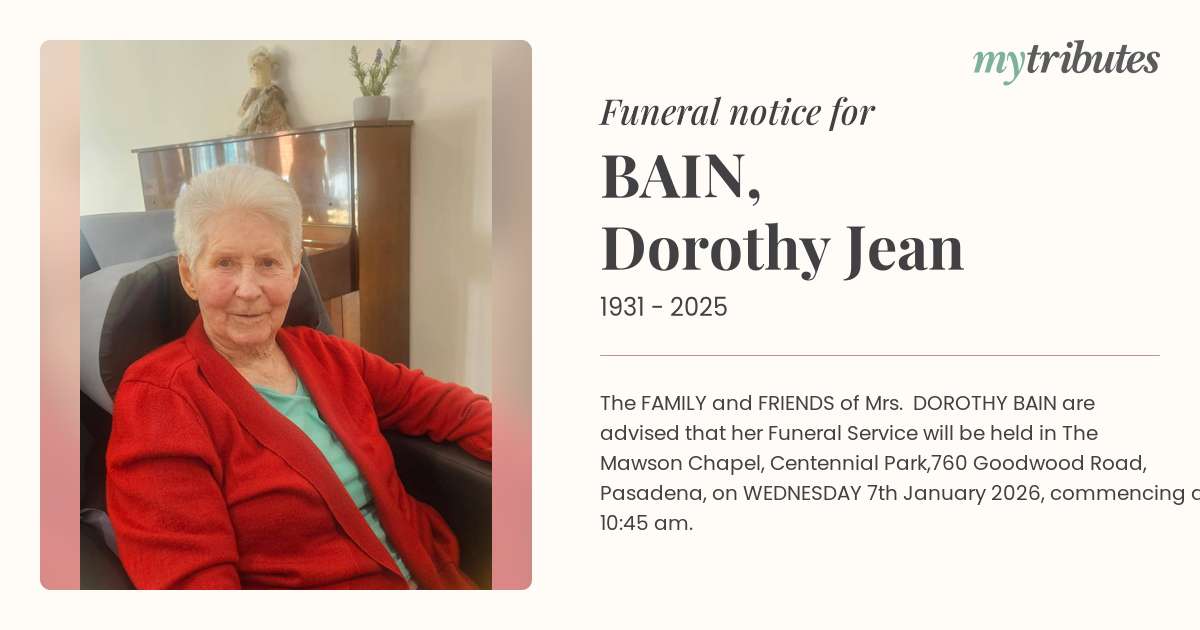 16°CThe FAMILY and FRIENDS of Mrs. DOROTHY BAIN are advised that her Funeral Service will be held in The Mawson Chapel, Centennial Park,