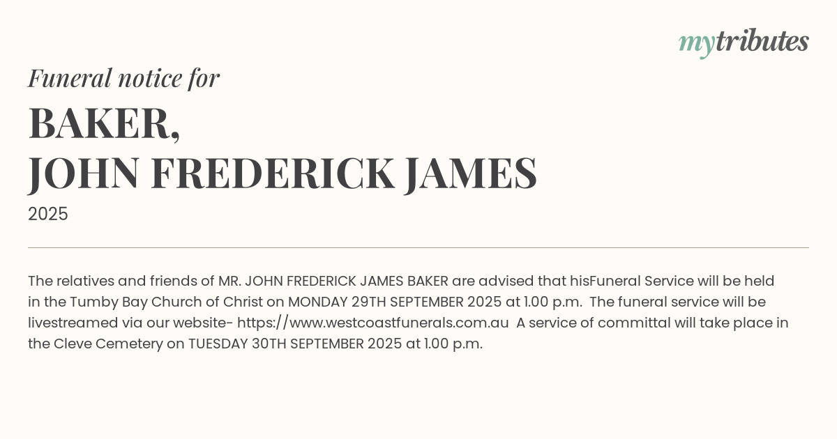 Funeral Service will be held in the Tumby Bay Church of Christ on MONDAY 29TH SEPTEMBER 2025 at 1.00 p.m.