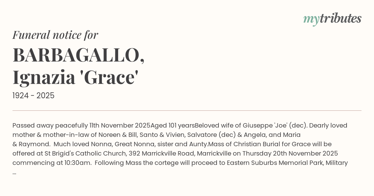 Mass of Christian Burial for Grace will be offered at St Brigid's Catholic Church, 392 Marrickville Road, Marrickville on Thursday 20th November 2025 commencing at 10:30am. Following Mass the cortege will proceed to Eastern Suburbs Memorial Park, Military Road, Matraville for interment.