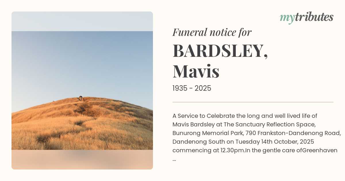 16°CA Service to Celebrate the long and well lived life of Mavis Bardsley at The Sanctuary Reflection Space, Bunurong Memorial Park, 790 Frankston-Dandenong Road, Dandenong South on Tuesday 14th October, 2025 commencing at 12.30pm.