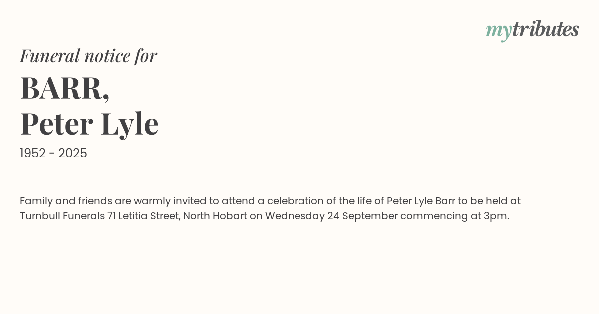 16°CFamily and friends are warmly invited to attend a celebration of the life of Peter Lyle Barr to be held at Turnbull Funerals 71 Letitia Street, North Hobart on Wednesday 24 September commencing at 3pm.