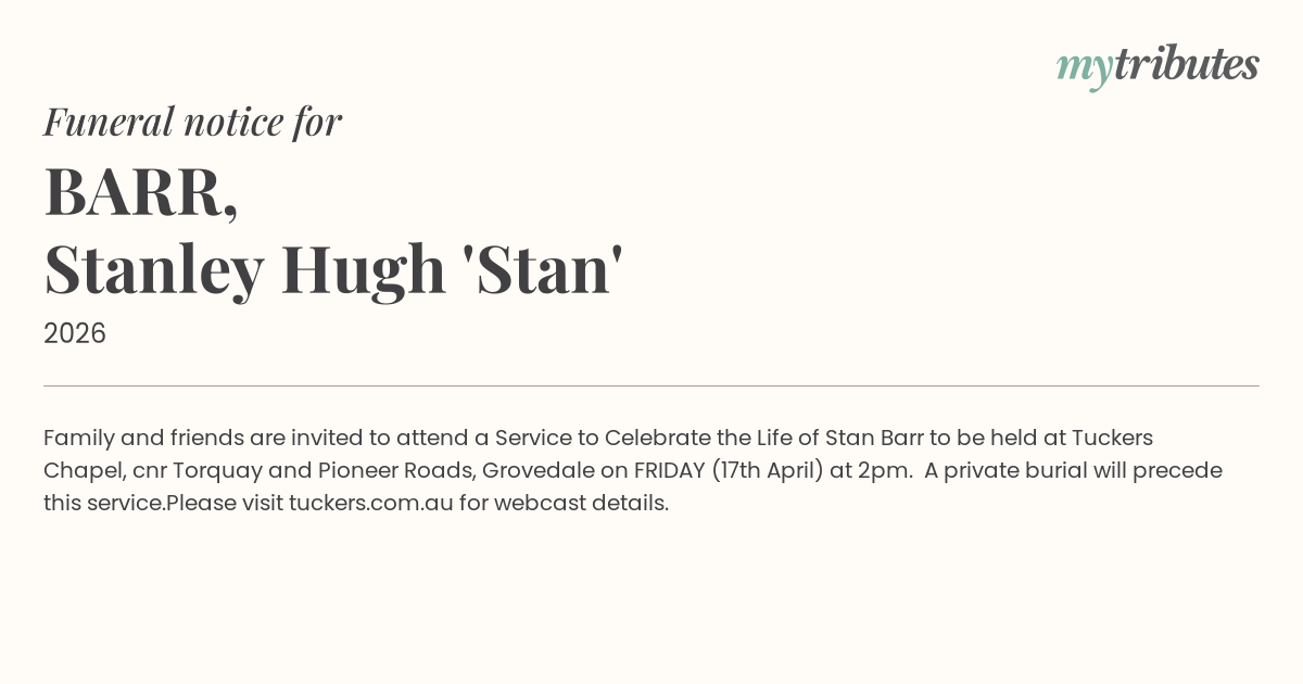 16°CFamily and friends are invited to attend a Service to Celebrate the Life of Stan Barr to be held at Tuckers Chapel, cnr Torquay and Pioneer Roads, Grovedale on FRIDAY (17th April) at 2pm. A private burial will precede this service.