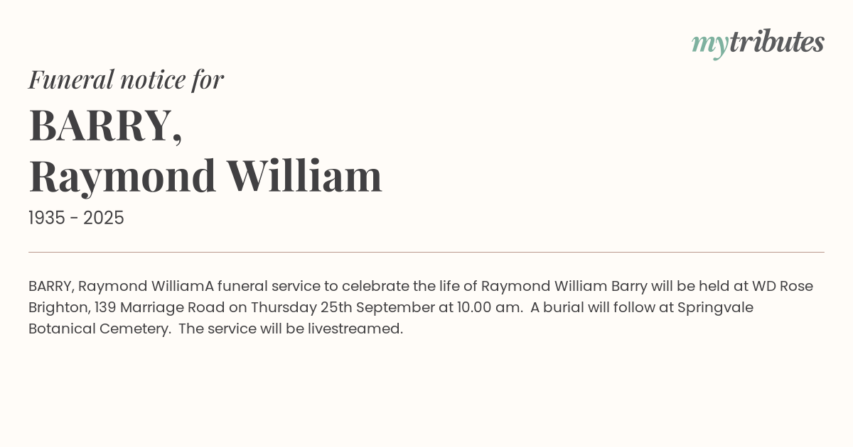 A funeral service to celebrate the life of Raymond William Barry will be held at WD Rose Brighton, 139 Marriage Road on Thursday 25th September at 10.00 am. A burial will follow at Springvale Botanical Cemetery. The service will be livestreamed.