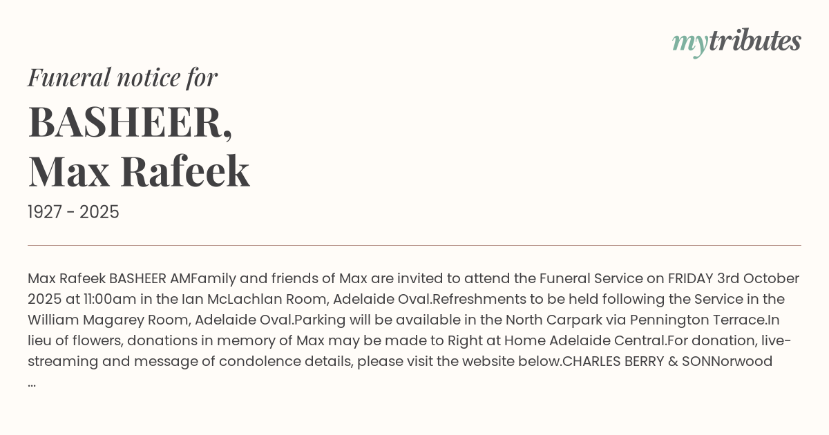 Family and friends of Max are invited to attend the Funeral Service on FRIDAY 3rd October 2025 at 11:00am in the Ian McLachlan Room, Adelaide Oval.