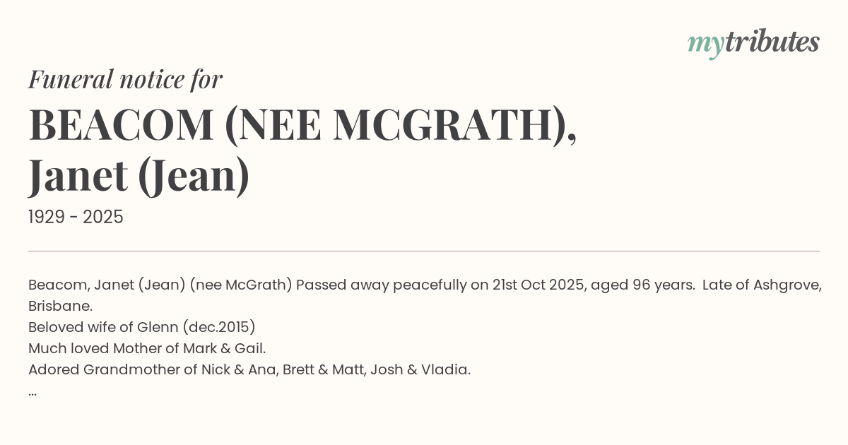 16°CBeacom, Janet (Jean) (nee McGrath) Passed away peacefully on 21st Oct 2025, aged 96 years. Late of Ashgrove, Brisbane.