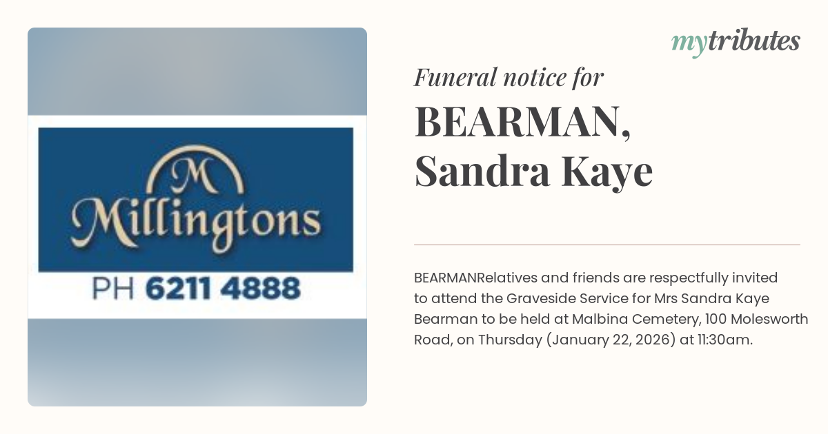 Relatives and friends are respectfully invited to attend the Graveside Service for Mrs Sandra Kaye Bearman to be