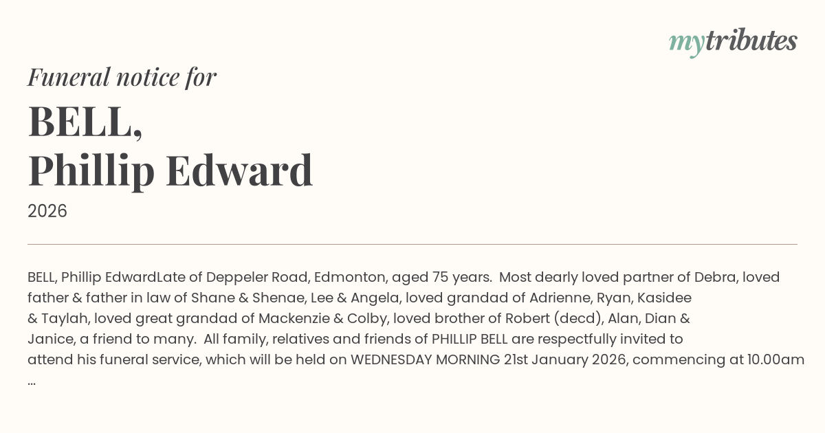 All family, relatives and friends of PHILLIP BELL are respectfully invited to attend his funeral service, which will be held on WEDNESDAY MORNING 21st January 2026, commencing at 10.00am in the Chapel of Heritage Brady Funeral Directors Crematorium,