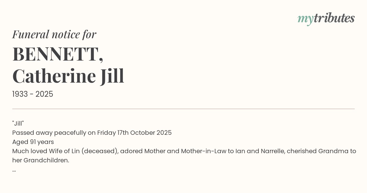 Relatives and friends are invited to attend a celebration of Catherine's life to be held in the George Hartnett Metropolitan Funeral Home Chapel, 782 Zillmere Road, Aspley commencing at 10am.