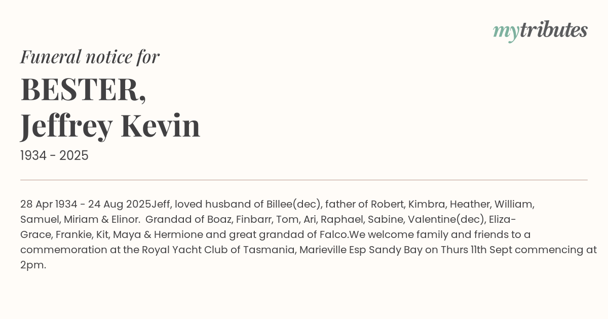 Jeff, loved husband of Billee(dec), father of Robert, Kimbra, Heather, William, Samuel, Miriam & Elinor. Grandad of Boaz, Finbarr, Tom, Ari, Raphael, Sabine, Valentine(dec), Eliza-Grace, Frankie, Kit, Maya & Hermione and great grandad of Falco.