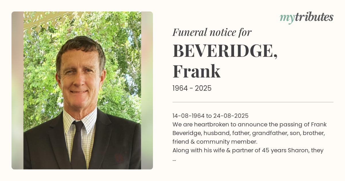 We are heartbroken to announce the passing of Frank Beveridge, husband, father, grandfather, son, brother, friend & community member.