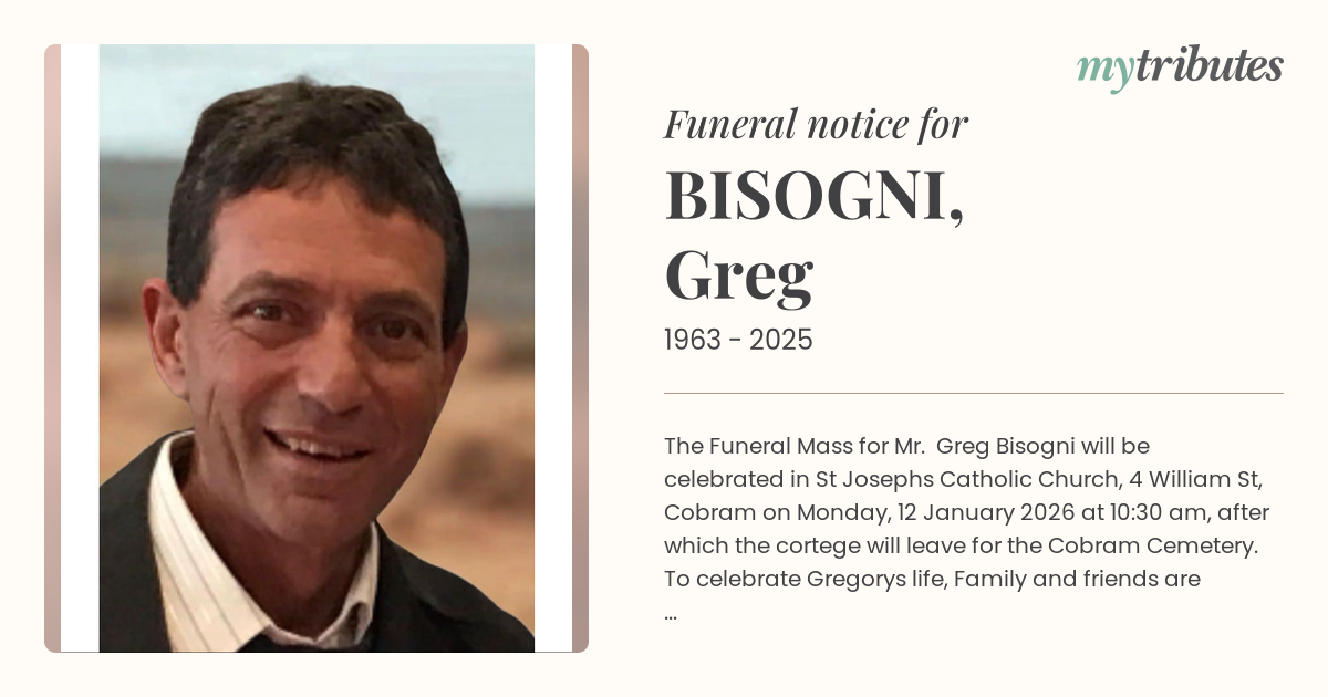 The Funeral Mass for Mr. Greg Bisogni will be celebrated in St Joseph’s Catholic Church, 4 William St, Cobram on Monday, 12 January 2026 at 10:30 am, after which the cortege will leave for the Cobram Cemetery. To celebrate Gregory’s life, Family and friends are warmly invited to attend.