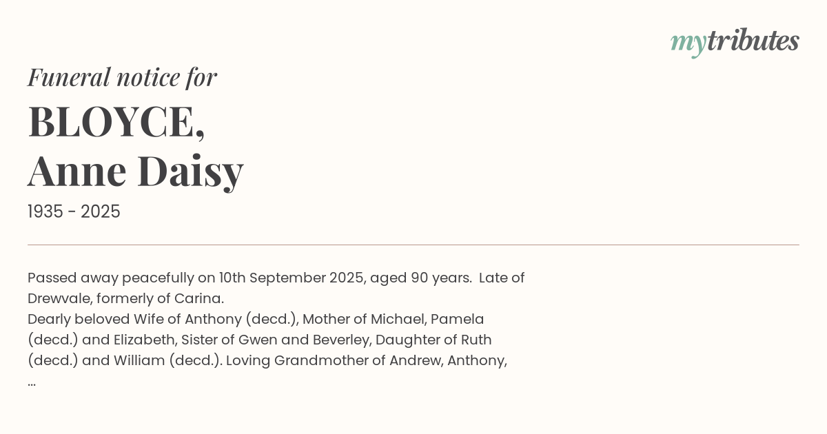 16°CPassed away peacefully on 10th September 2025, aged 90 years. Late of