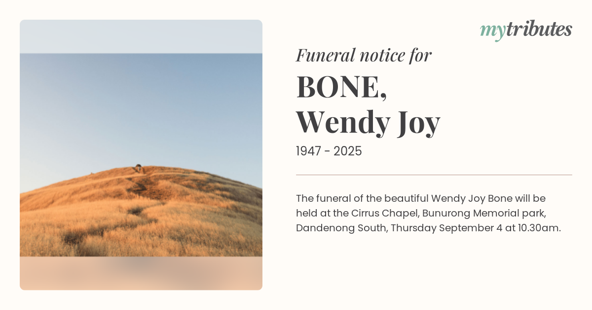 16°CThe funeral of the beautiful Wendy Joy Bone will be held at the Cirrus Chapel, Bunurong Memorial park, Dandenong South, Thursday September 4 at 10.30am.