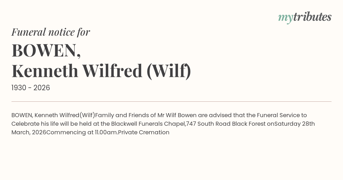 Mr Wilf Bowen are advised that the Funeral Service to Celebrate his life will be held at the Blackwell Funerals Chapel,