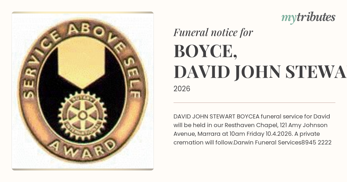 A funeral service for David will be held in our Resthaven Chapel, 121 Amy Johnson Avenue, Marrara at 10am Friday 10.4.2026. A private cremation will follow.