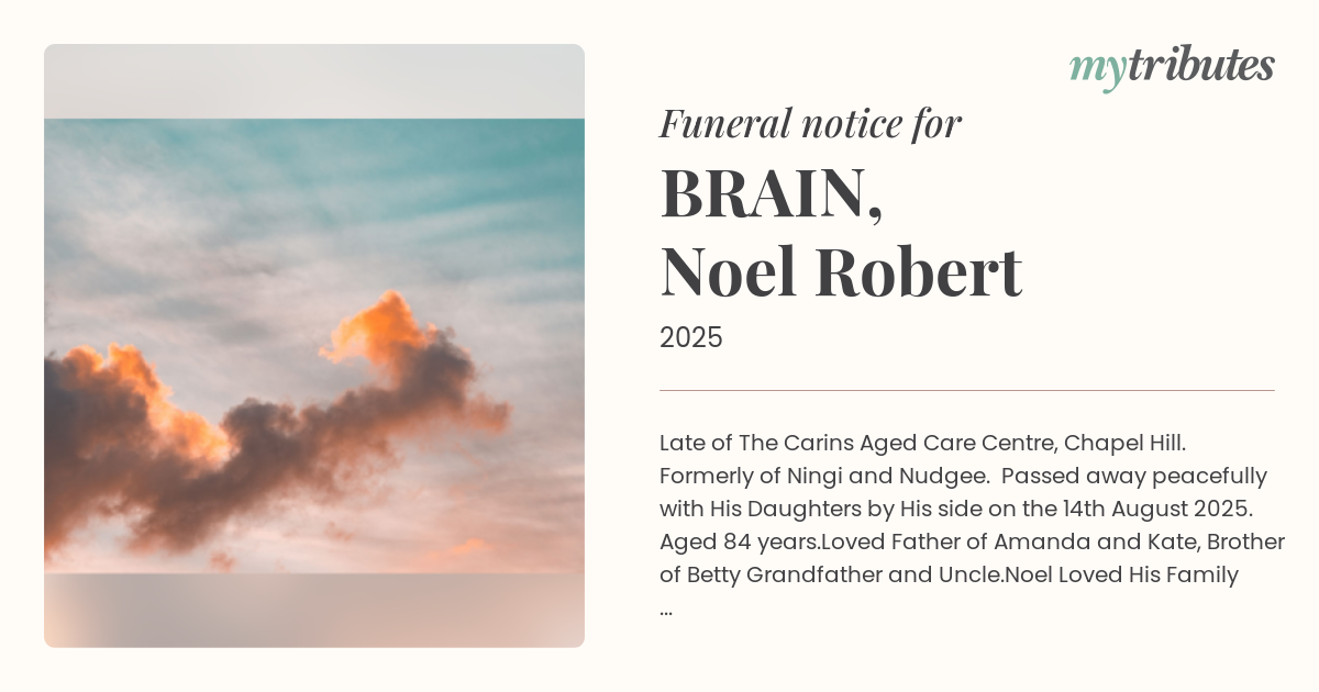 16°CLate of The Carins Aged Care Centre, Chapel Hill. Formerly of Ningi and Nudgee. Passed away peacefully with His Daughters by His side on the 14th August 2025. Aged 84 years.