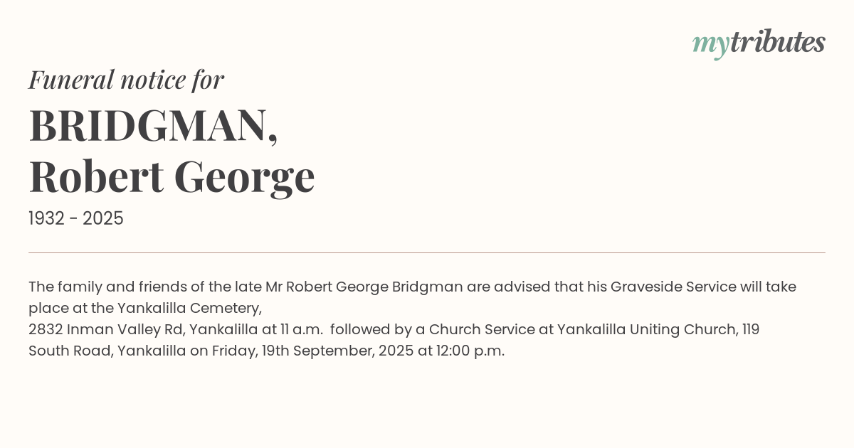 16°CThe family and friends of the late Mr Robert George Bridgman are advised that his Graveside Service will take place at the Yankalilla Cemetery,