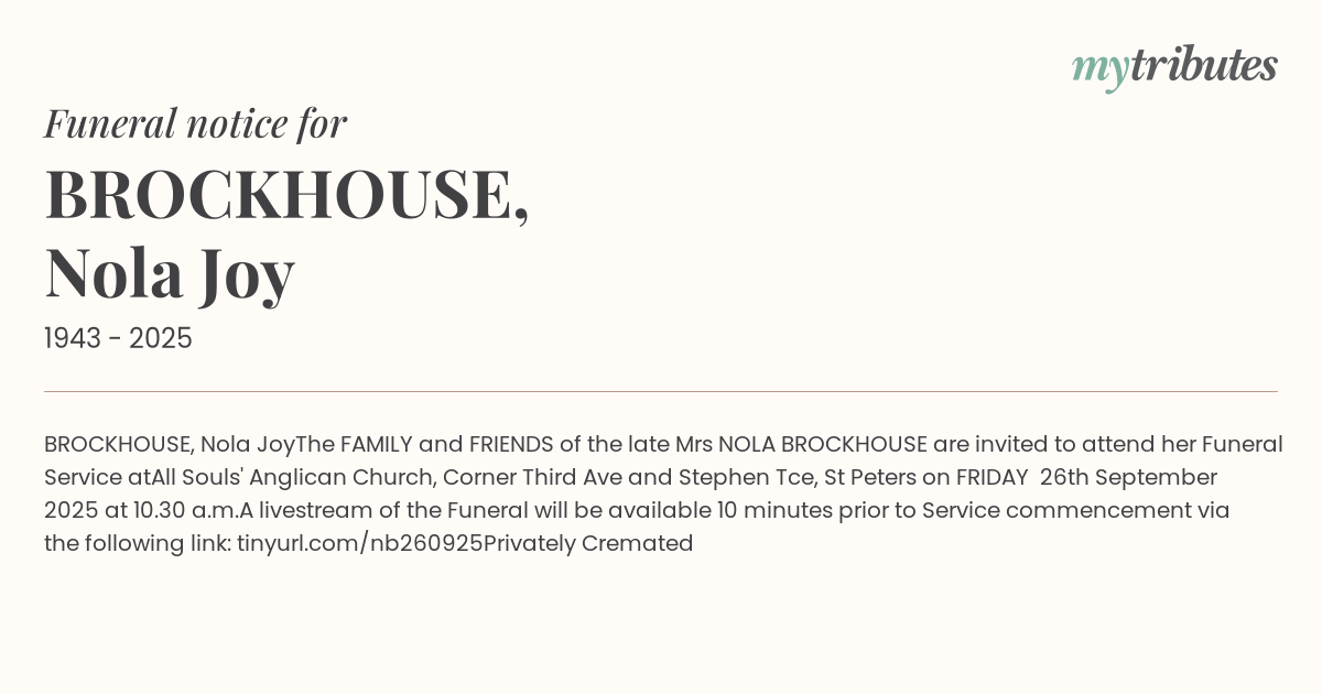 The FAMILY and FRIENDS of the late Mrs NOLA BROCKHOUSE are invited to attend her Funeral Service at