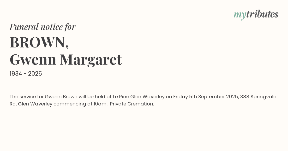16°CThe service for Gwenn Brown will be held at Le Pine Glen Waverley on Friday 5th September 2025, 388 Springvale Rd, Glen Waverley commencing at 10am. Private Cremation.