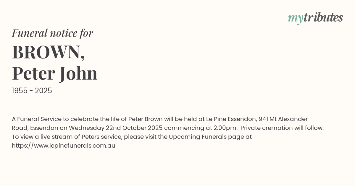16°CA Funeral Service to celebrate the life of Peter Brown will be held at Le Pine Essendon, 941 Mt Alexander Road, Essendon on Wednesday 22nd October 2025 commencing at 2.00pm. Private cremation will follow.