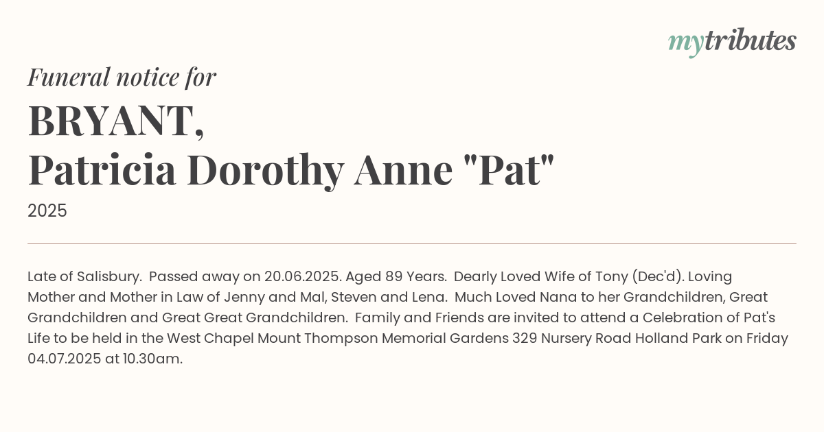 16°CLate of Salisbury. Passed away on 20.06.2025. Aged 89 Years. Dearly Loved Wife of Tony (Dec'd). Loving Mother and Mother in Law of Jenny and Mal, Steven and Lena. Much Loved Nana to her Grandchildren, Great Grandchildren and Great Great Grandchildren. Family and Friends are invited to attend a Celebration of Pat's Life to be held in the West Chapel Mount Thompson Memorial Gardens 329 Nursery Road Holland Park on Friday 04.07.2025 at 10.30am.