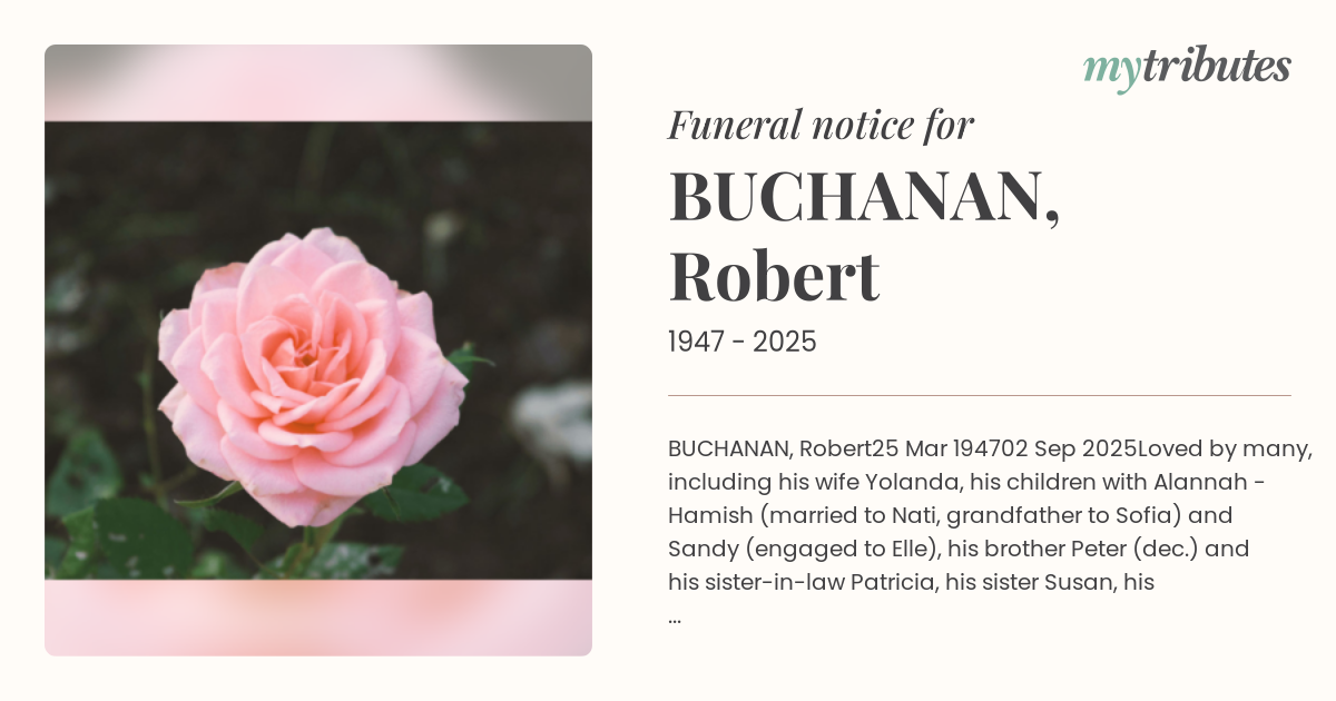 Loved by many, including his wife Yolanda, his children with Alannah - Hamish (married to Nati, grandfather to Sofia) and Sandy (engaged to Elle), his brother Peter (dec.) and his sister-in-law Patricia, his sister Susan, his cousin Diane, his nephews - Sam, Patrick, Spike, Michael, George and his niece, India and his great friends Douglas and Rosalyn Green, Gavin Youl and Linda Rowland.