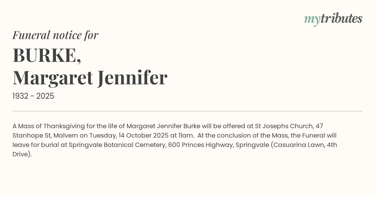 16°CA Mass of Thanksgiving for the life of Margaret Jennifer Burke will be offered at St Joseph’s Church, 47 Stanhope St, Malvern on Tuesday, 14 October 2025 at 11am. At the conclusion of the Mass, the Funeral will leave for burial at Springvale Botanical Cemetery, 600 Princes Highway, Springvale (Casuarina Lawn, 4th Drive).