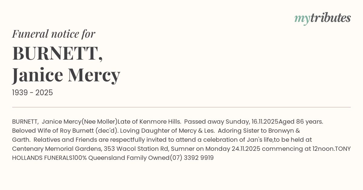 Beloved Wife of Roy Burnett (dec'd). Loving Daughter of Mercy & Les. Adoring Sister to Bronwyn & Garth.