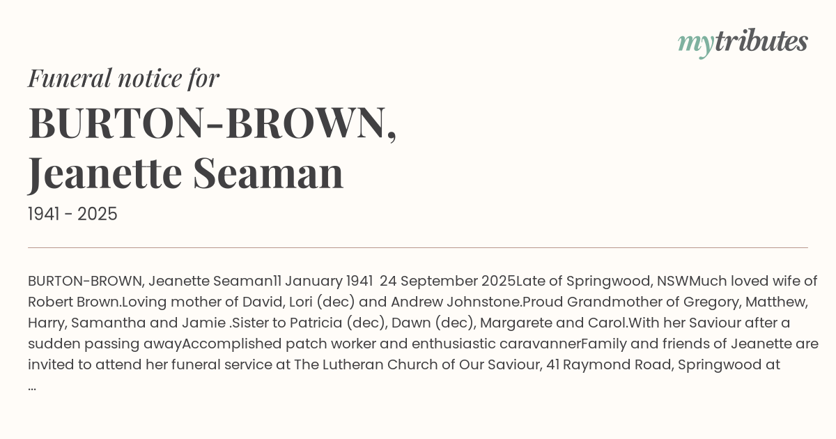 Family and friends of Jeanette are invited to attend her funeral service at The Lutheran Church of Our Saviour, 41 Raymond Road, Springwood at 11:00am Monday 13 October, 2025.