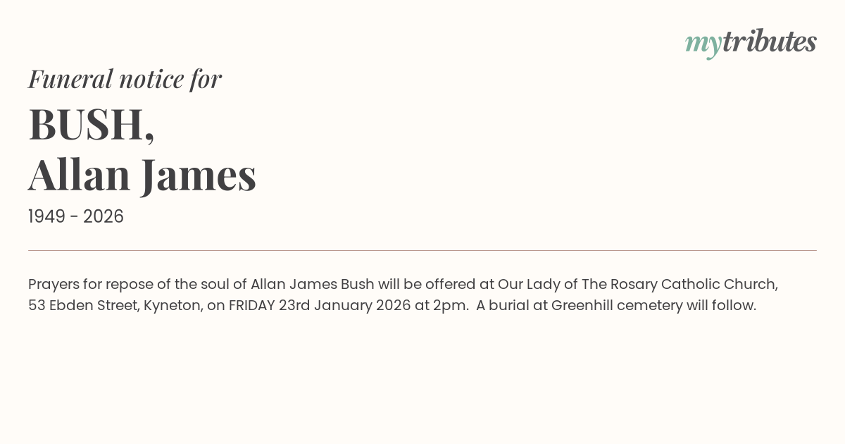 16°CPrayers for repose of the soul of Allan James Bush will be offered at Our Lady of The Rosary Catholic Church, 53 Ebden Street, Kyneton, on FRIDAY 23rd January 2026 at 2pm.