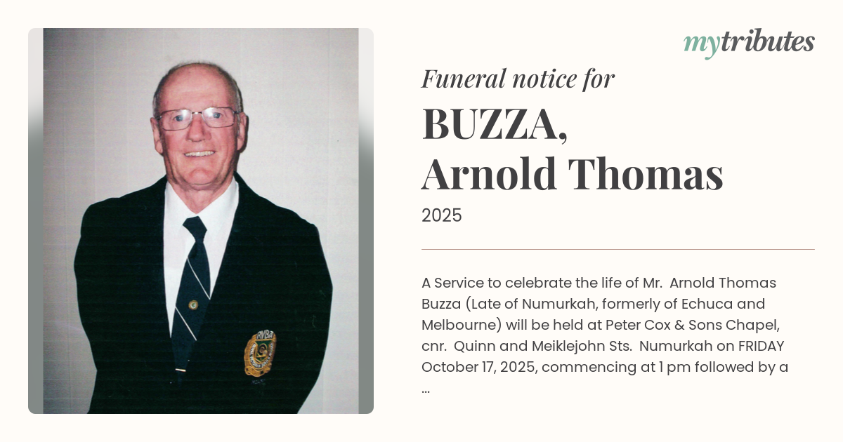 16°CA Service to celebrate the life of Mr. Arnold Thomas Buzza (Late of Numurkah, formerly of Echuca and Melbourne) will be held at Peter Cox & Sons Chapel, cnr. Quinn and Meiklejohn Sts. Numurkah on FRIDAY October 17, 2025, commencing at 1 pm followed by a Private Cremation.