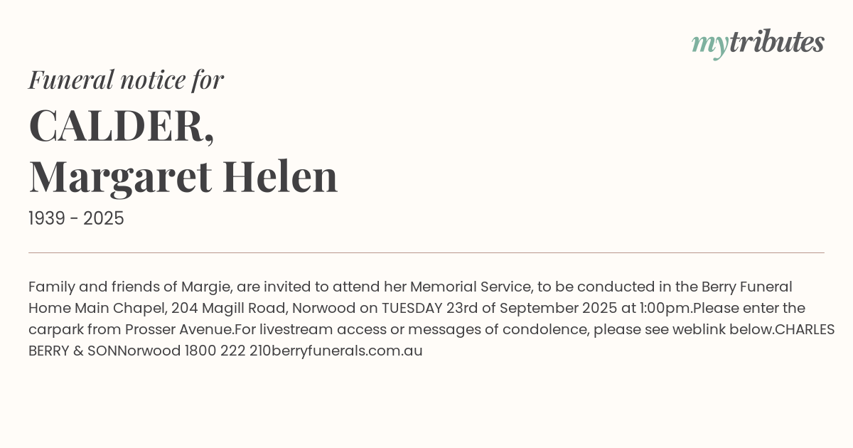 16°CFamily and friends of Margie, are invited to attend her Memorial Service, to be conducted in the Berry Funeral Home Main Chapel, 204 Magill Road, Norwood on TUESDAY 23rd of September 2025 at 1:00pm.