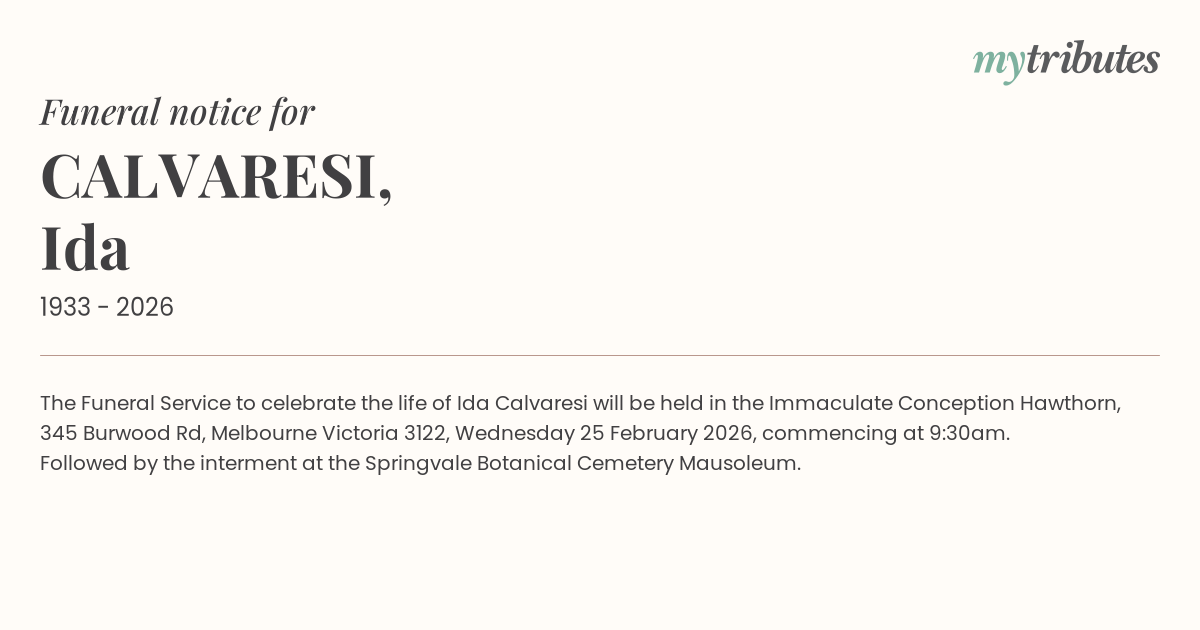 16°CThe Funeral Service to celebrate the life of Ida Calvaresi will be held in the Immaculate Conception Hawthorn, 345 Burwood Rd, Melbourne Victoria 3122, Wednesday 25 February 2026, commencing at 9:30am.