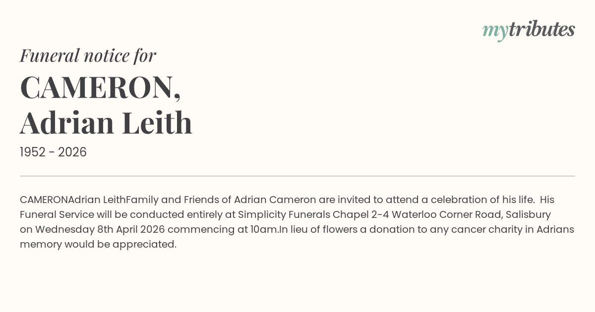 Family and Friends of Adrian Cameron are invited to attend a celebration of his life. His Funeral Service will be conducted entirely at Simplicity Funerals Chapel 2-4 Waterloo Corner Road, Salisbury on Wednesday 8th April 2026 commencing at 10am.