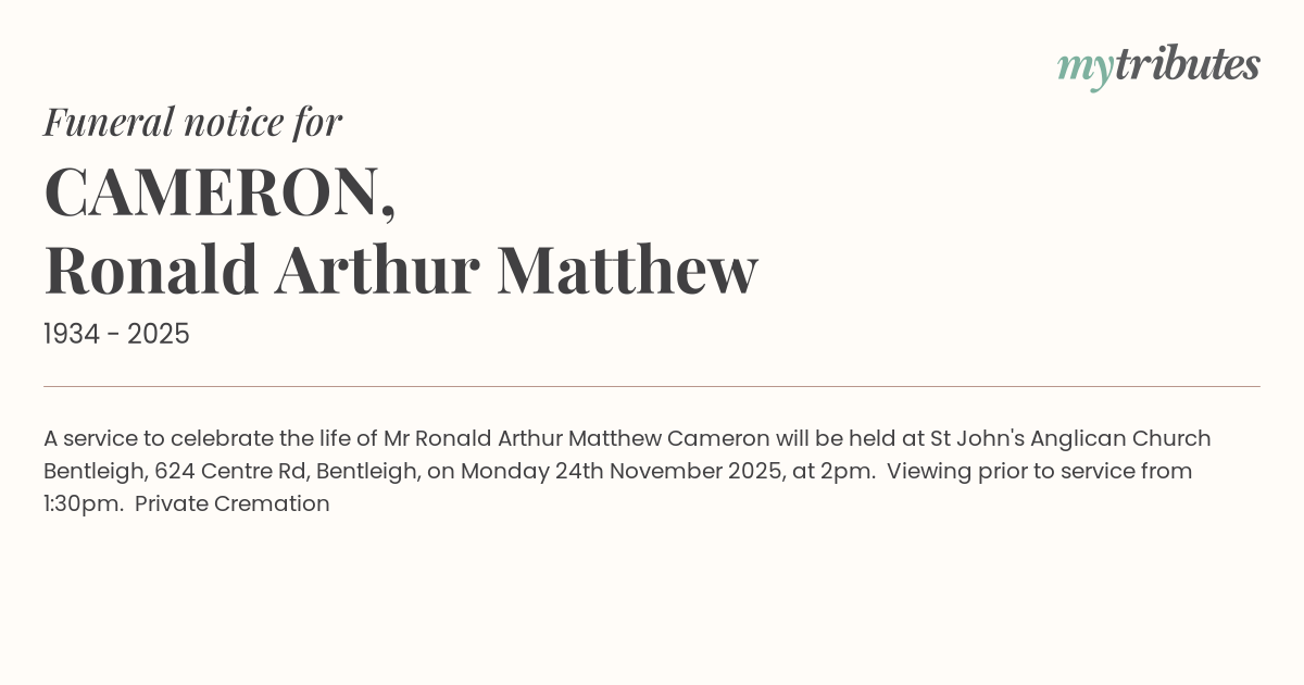 16°CA service to celebrate the life of Mr Ronald Arthur Matthew Cameron will be held at St John's Anglican Church Bentleigh, 624 Centre Rd, Bentleigh, on Monday 24th November 2025, at 2pm.