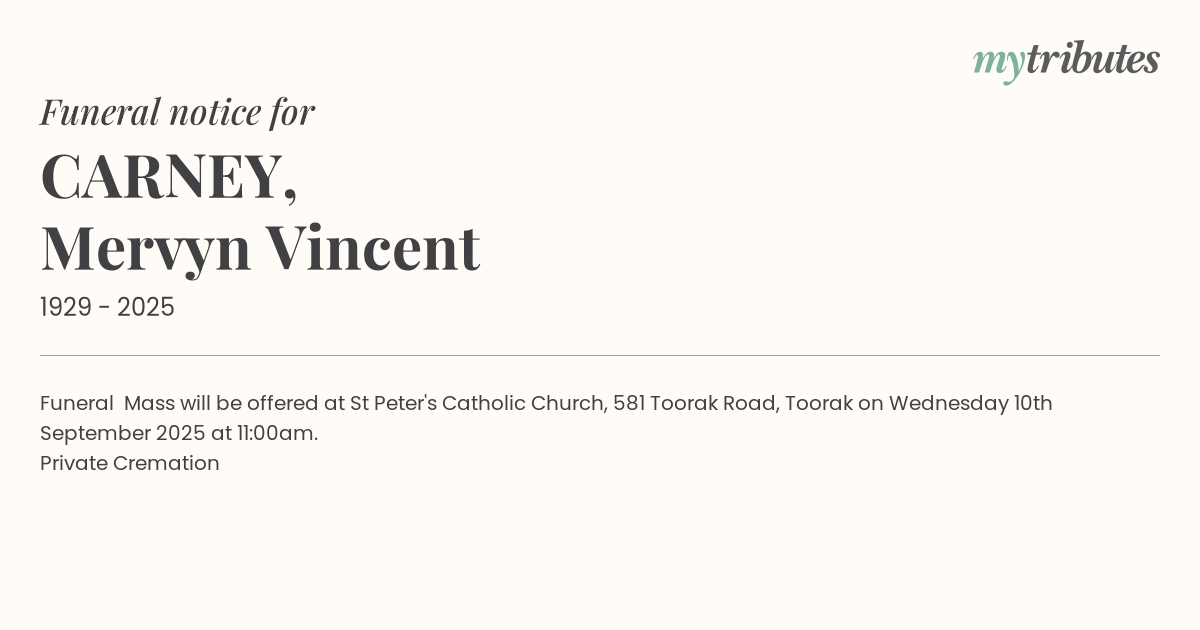 16°CFuneral Mass will be offered at St Peter's Catholic Church, 581 Toorak Road, Toorak on Wednesday 10th September 2025 at 11:00am.