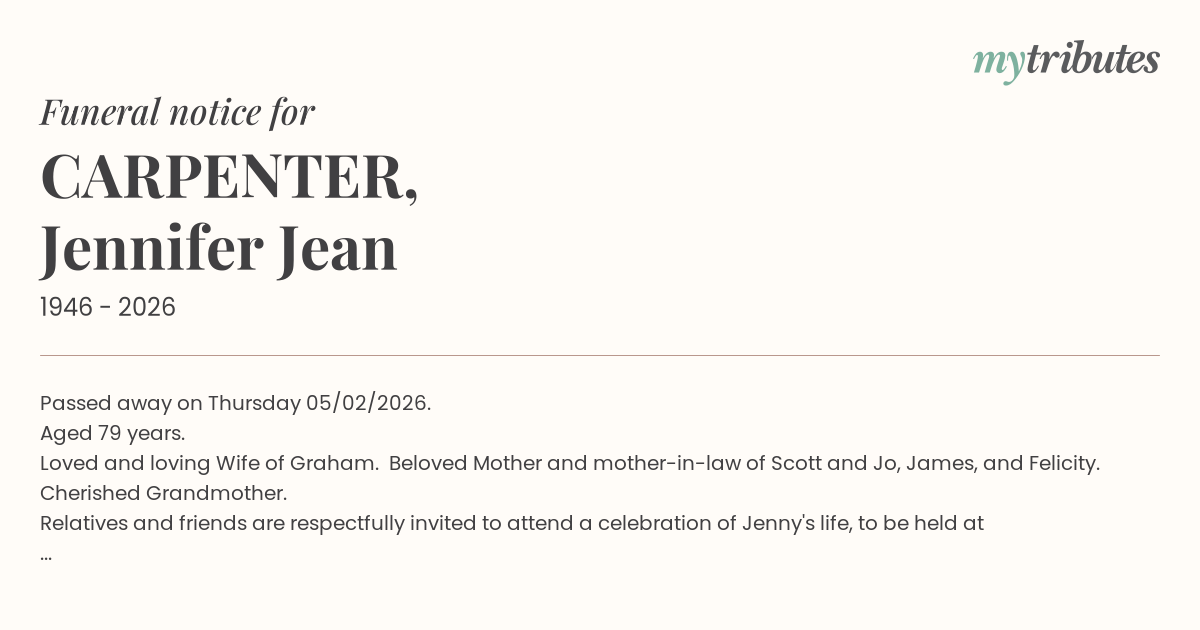 Relatives and friends are respectfully invited to attend a celebration of Jenny's life, to be held at Sunnybank District Baptist Church, 127 Nemies Road, Runcorn on Monday 16/02/2026 at 10:30am.
