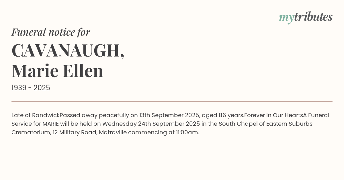 A Funeral Service for MARIE will be held on Wednesday 24th September 2025 in the South Chapel of Eastern Suburbs Crematorium, 12 Military Road, Matraville commencing at 11:00am.