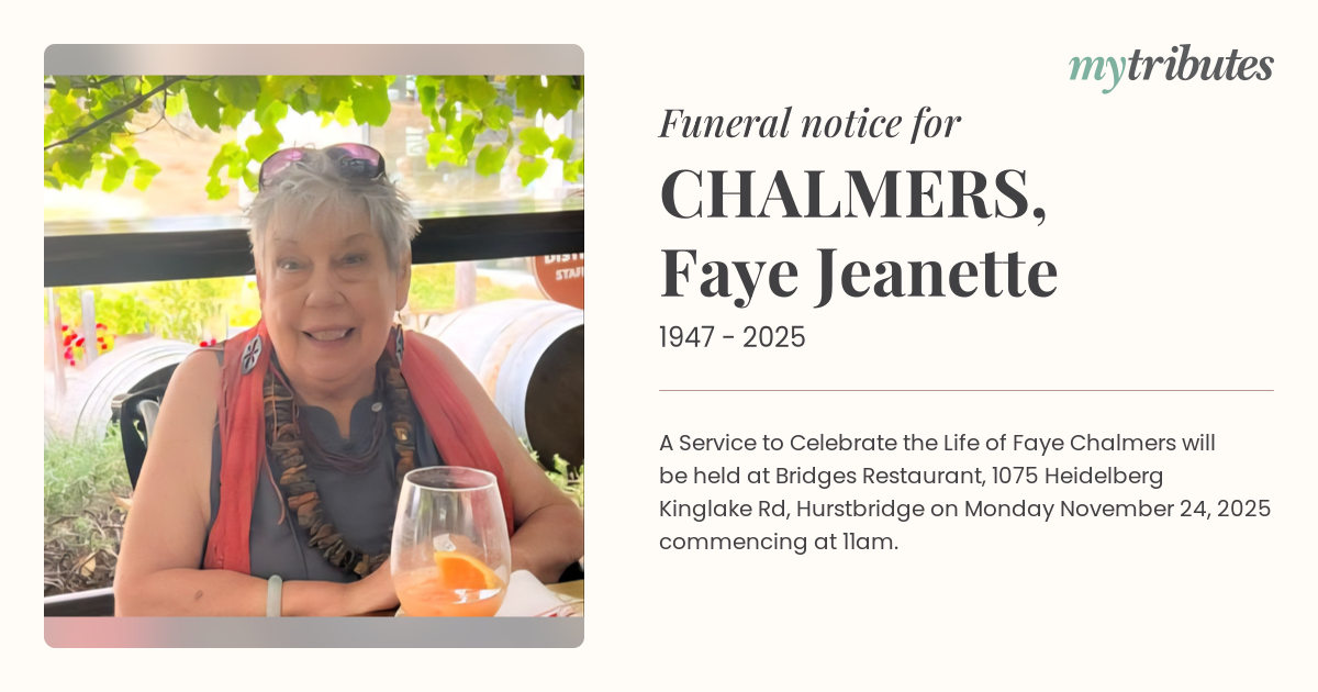 16°CA Service to Celebrate the Life of Faye Chalmers will be held at Bridges Restaurant, 1075 Heidelberg – Kinglake Rd, Hurstbridge on Monday November 24, 2025 commencing at 11am.