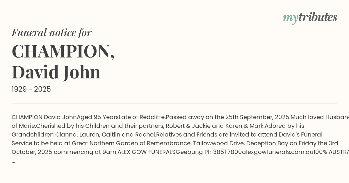 Relatives and Friends are invited to attend David's Funeral Service to be held at Great Northern Garden of Remembrance, Tallowwood Drive, Deception Bay on Friday the 3rd October, 2025 commencing at 9am.