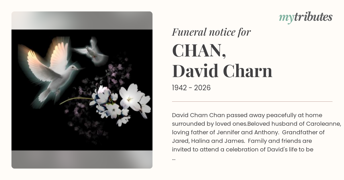 16°CDavid Charn Chan passed away peacefully at home surrounded by loved ones.