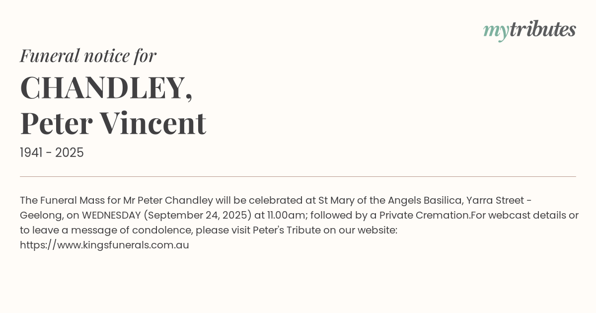 The Funeral Mass for Mr Peter Chandley will be celebrated at St Mary of the Angels Basilica, Yarra Street - Geelong, on WEDNESDAY (September 24, 2025) at 11.00am; followed by a Private Cremation.