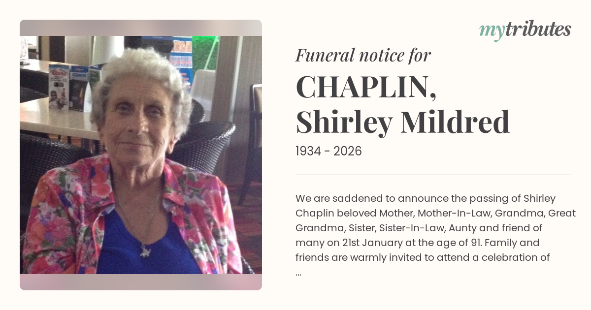 16°CWe are saddened to announce the passing of Shirley Chaplin beloved Mother, Mother-In-Law, Grandma, Great Grandma, Sister, Sister-In-Law, Aunty and friend of many on 21st January at the age of 91. Family and friends are warmly invited to attend a celebration of Shirley's life on Friday 6th February at 11am, at George Hartnett Metropolitan Funerals, The Eileen Hartnett Chapel, 19-21 Anzac Avenue Redcliffe. Forever loved and remembered.