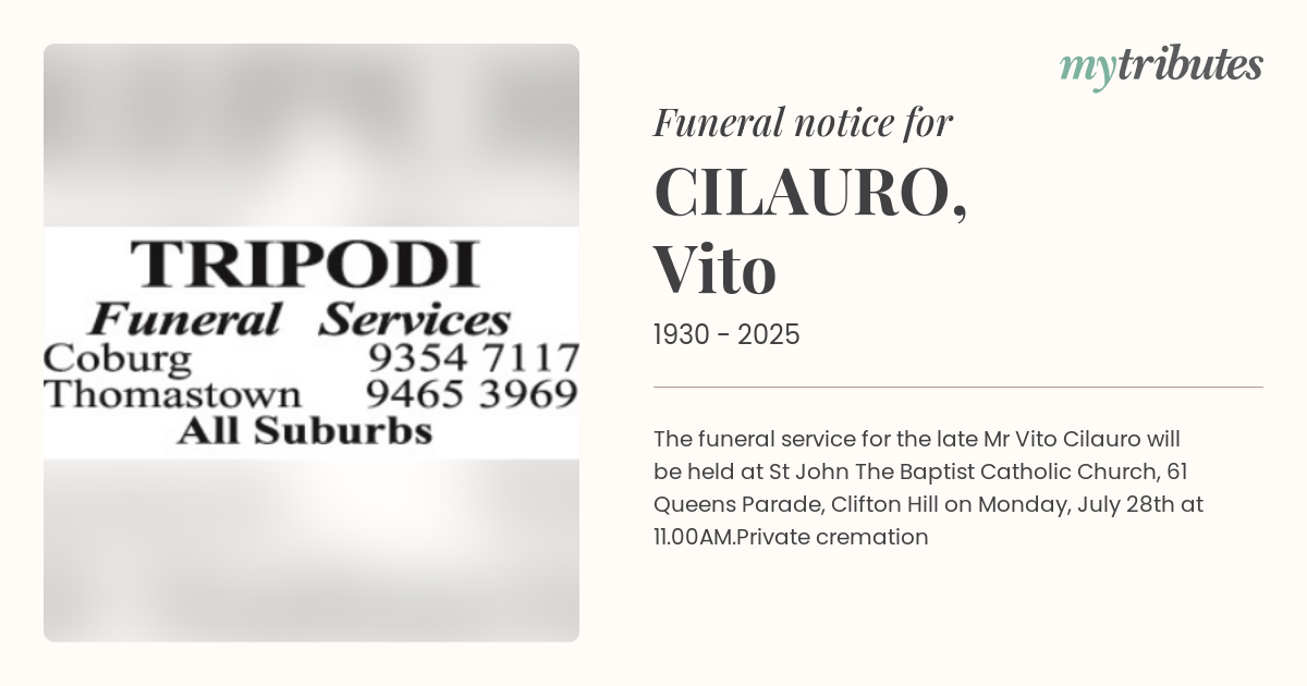 16°CThe funeral service for the late Mr Vito Cilauro will be held at St John The Baptist Catholic Church, 61 Queens Parade, Clifton Hill on Monday, July 28th at 11.00AM.
