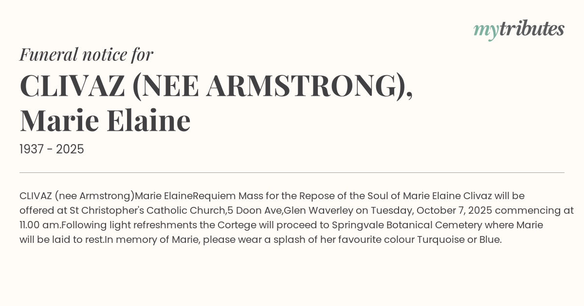 Requiem Mass for the Repose of the Soul of Marie Elaine Clivaz will be offered at St Christopher's Catholic Church,