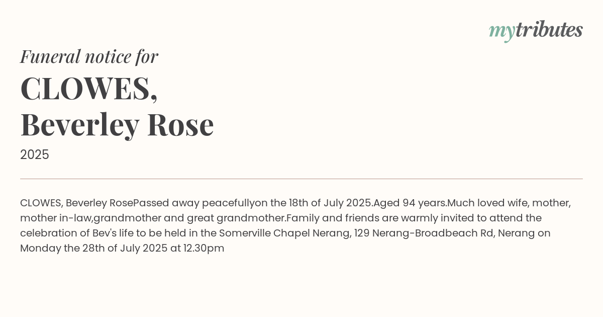 Bev's life to be held in the Somerville Chapel Nerang, 129 Nerang-Broadbeach Rd, Nerang on Monday the 28th of July 2025 at 12.30pm