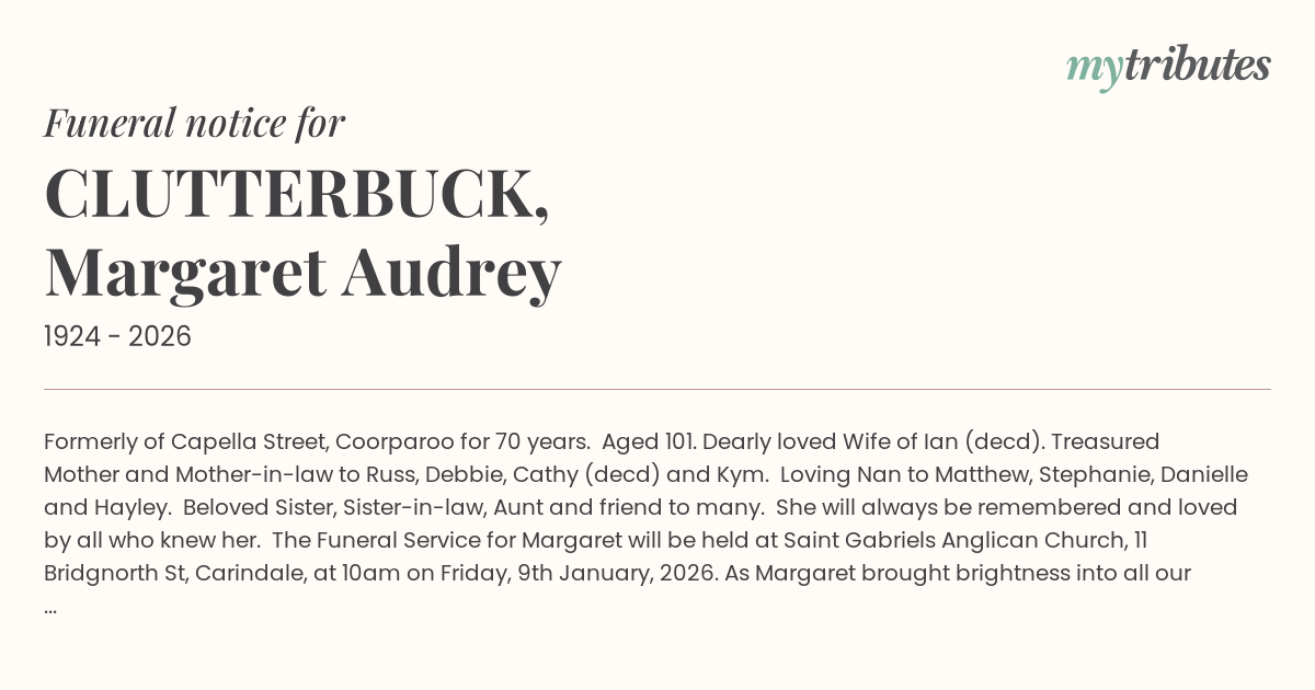 Aged 101. Dearly loved Wife of Ian (dec’d). Treasured Mother and Mother-in-law to Russ, Debbie, Cathy (dec’d) and Kym. Loving Nan to Matthew, Stephanie, Danielle and Hayley. Beloved Sister, Sister-in-law, Aunt and friend to many. She will always be remembered and loved by all who knew her. The Funeral Service for Margaret will be held at Saint Gabriel’s Anglican Church, 11 Bridgnorth St, Carindale, at 10am on Friday, 9th January, 2026. As Margaret brought brightness into all our lives, please wear something bright to commemorate her.